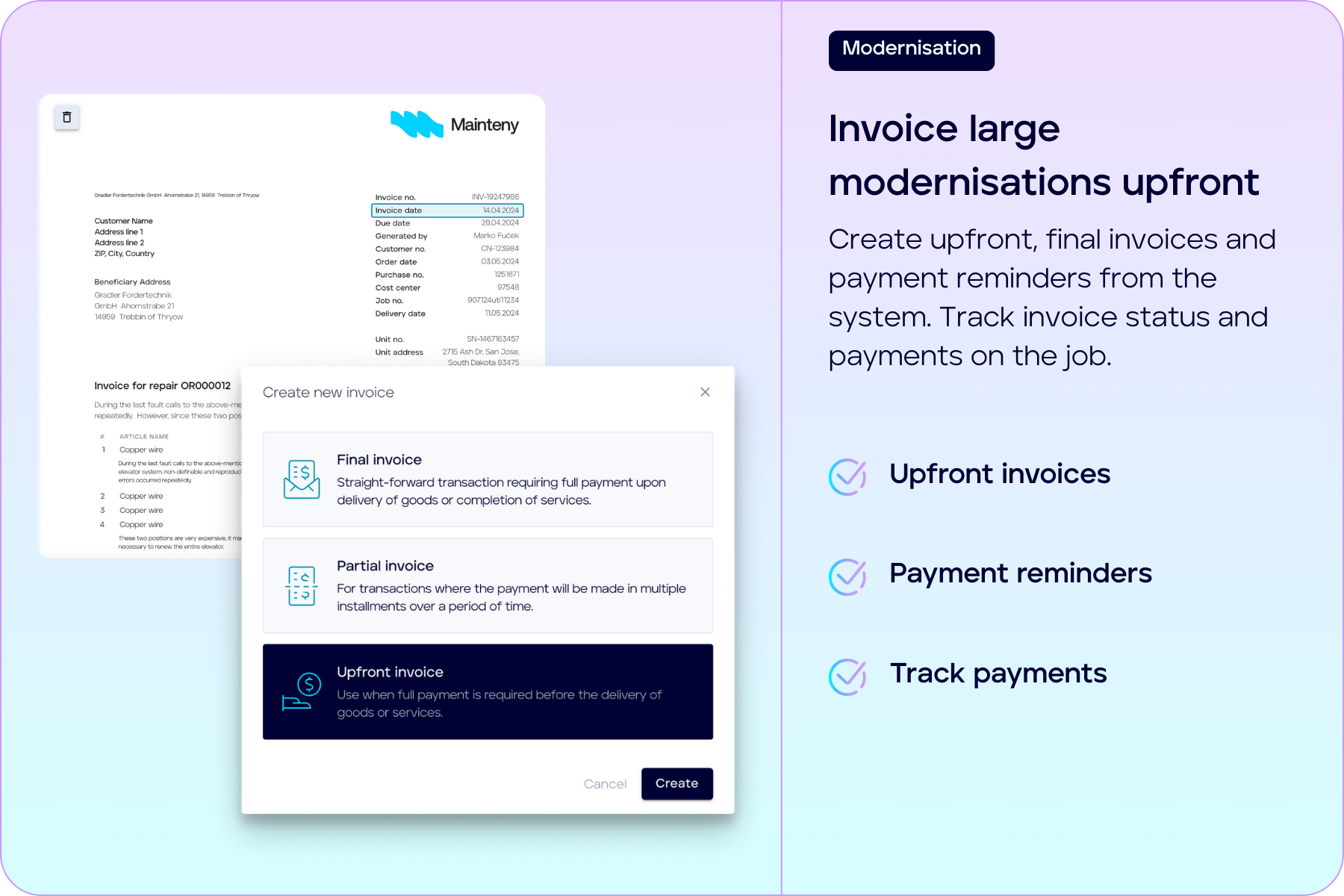 Yes, Mainteny allows you to set up automated maintenance reminders based on service intervals per asset. Invoices can be generated automatically from completed jobs or fixed invoice cycles. All of this with built-in support for payment reminders and credit notes—saving you time and ensuring nothing falls through the cracks.