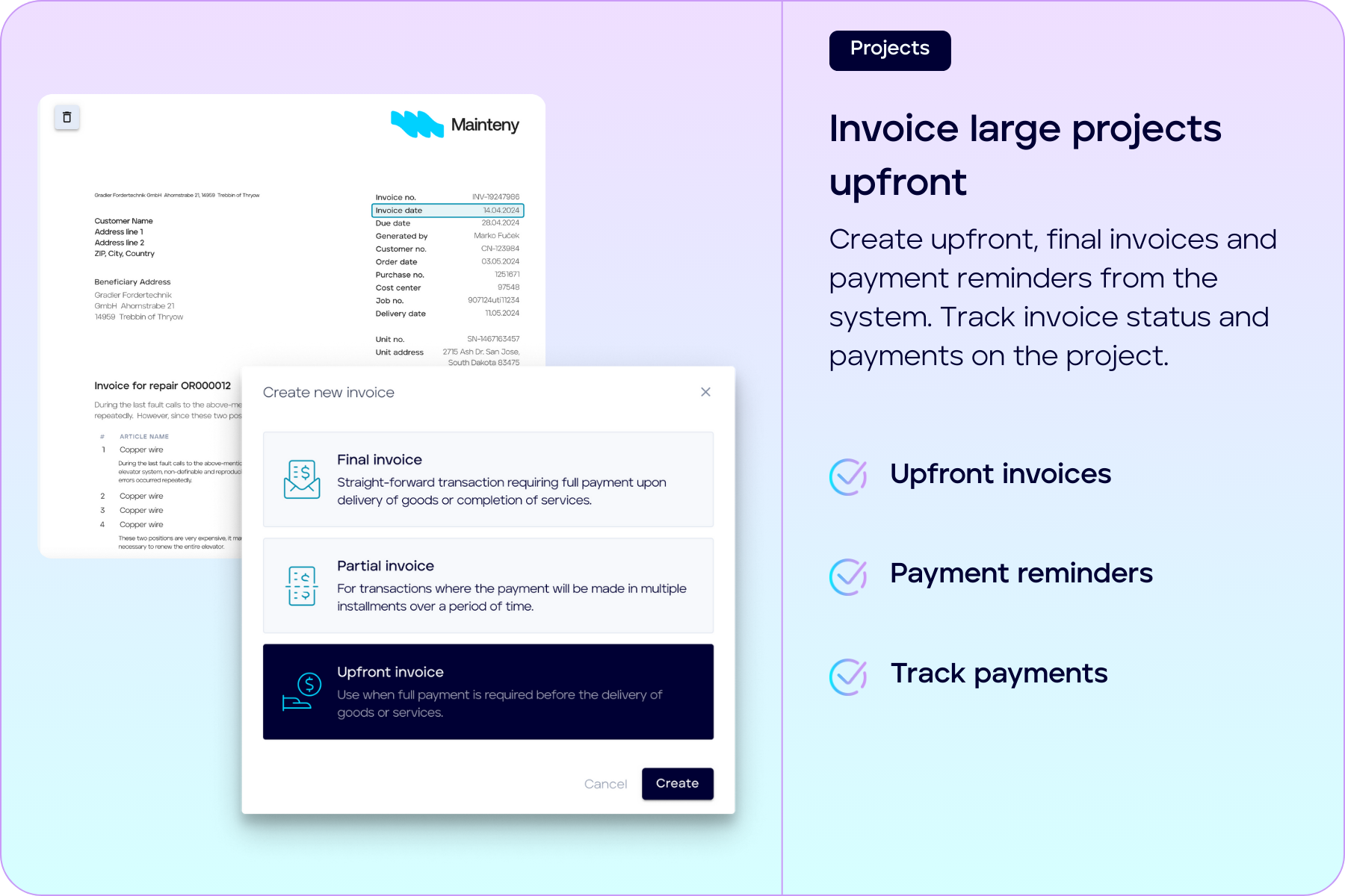 Yes, Mainteny allows you to set up automated maintenance reminders based on service intervals per asset. Invoices can be generated automatically from completed jobs or fixed invoice cycles. All of this with built-in support for payment reminders and credit notes—saving you time and ensuring nothing falls through the cracks.